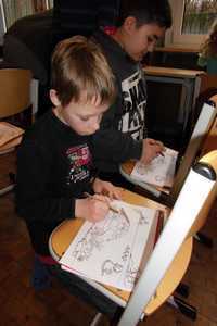 Kinder hatten Buntstifte und eine Malunterlage mitgebracht.