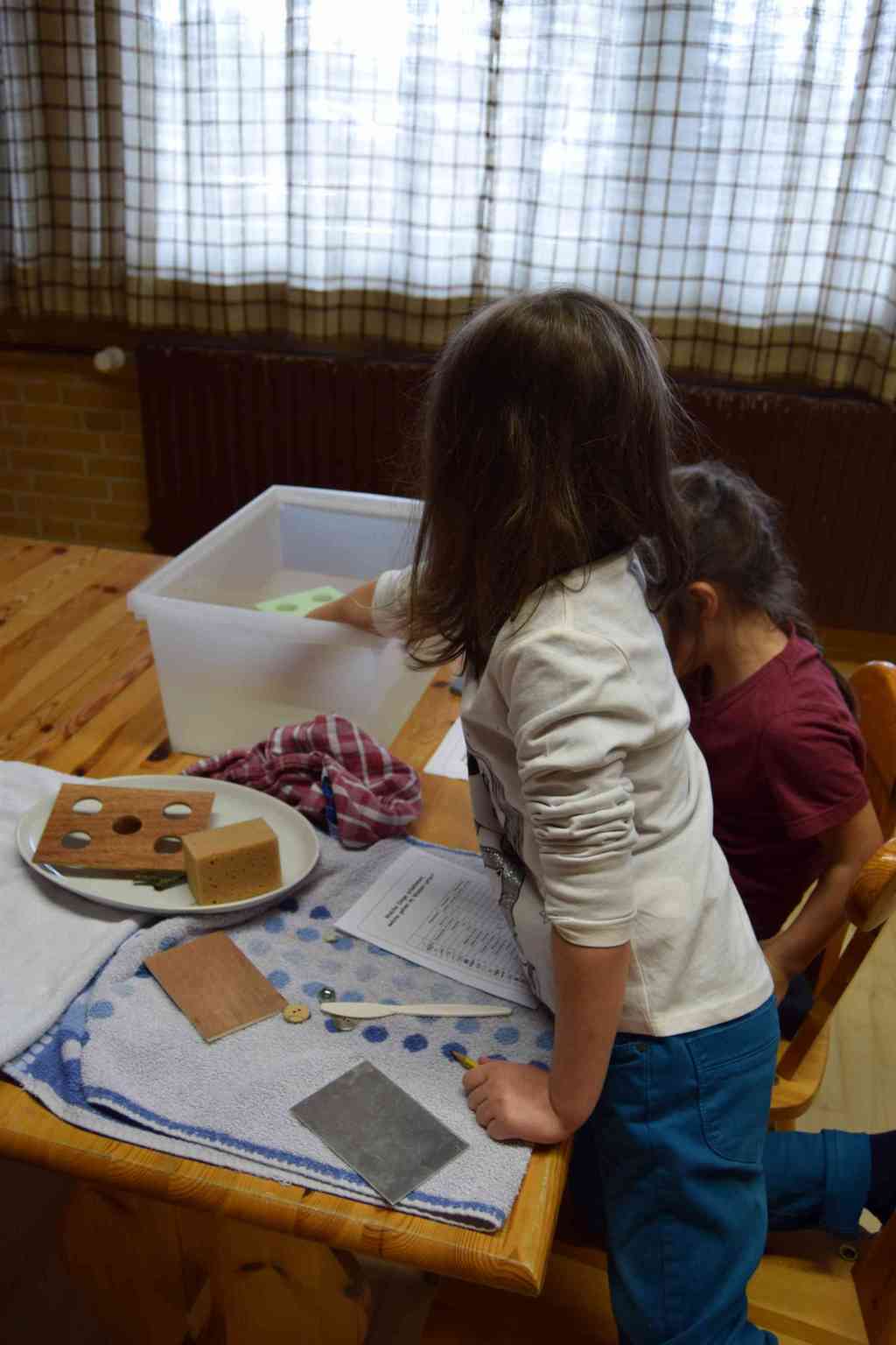 im Team und forscht zum Thema „sinken und schwimmen“.