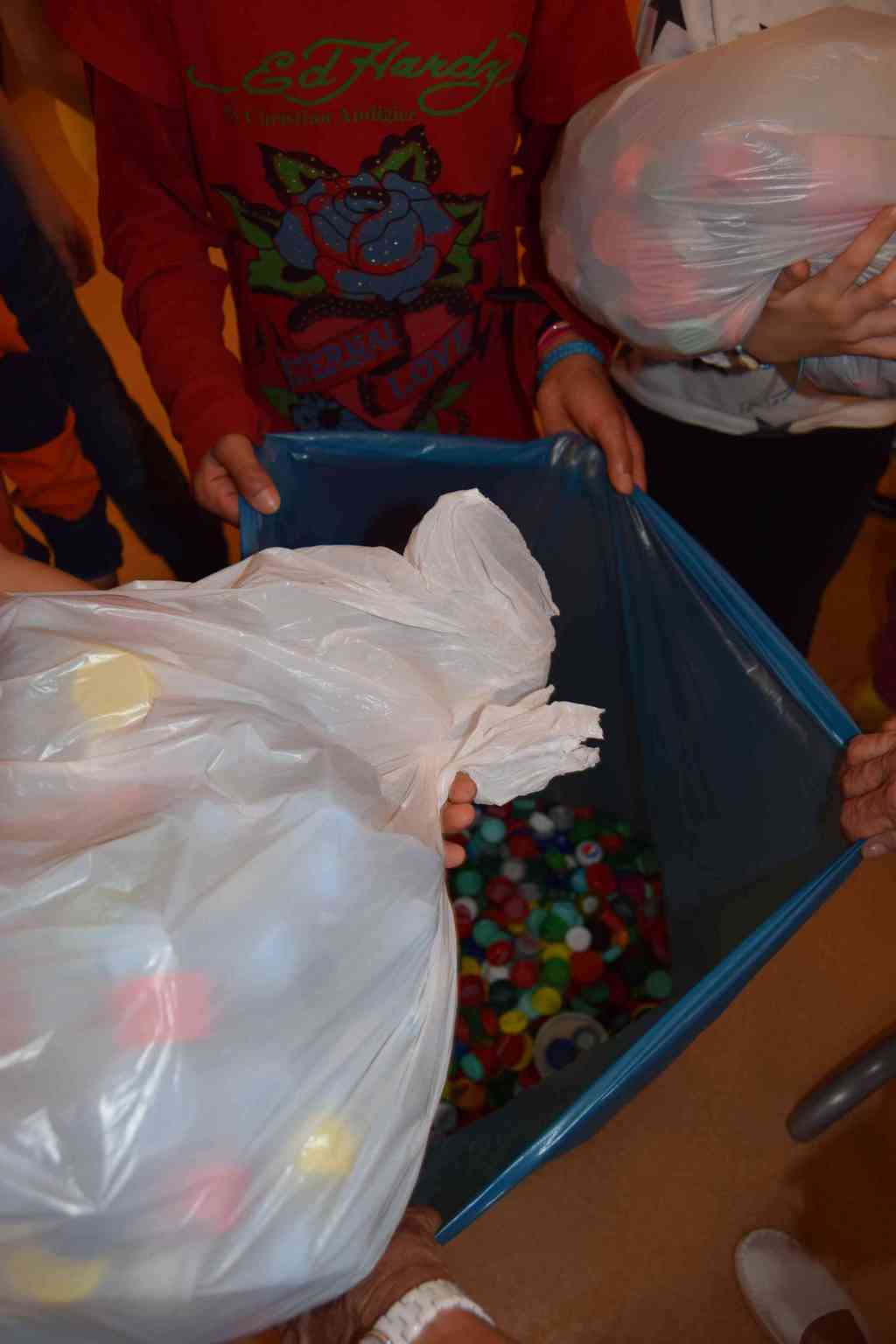 Säcke mit den gesammelten Kunststoffdeckeln in der Schule