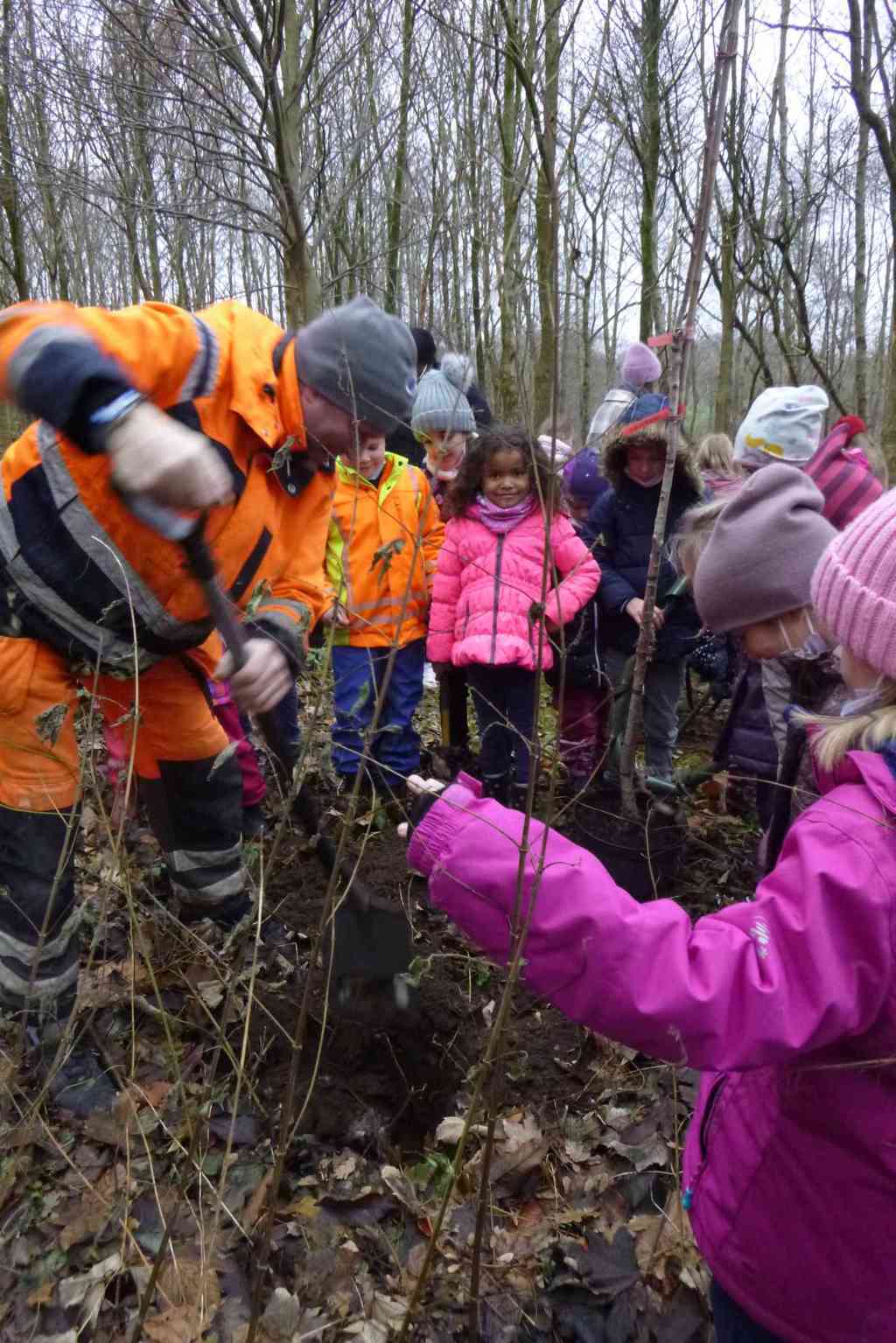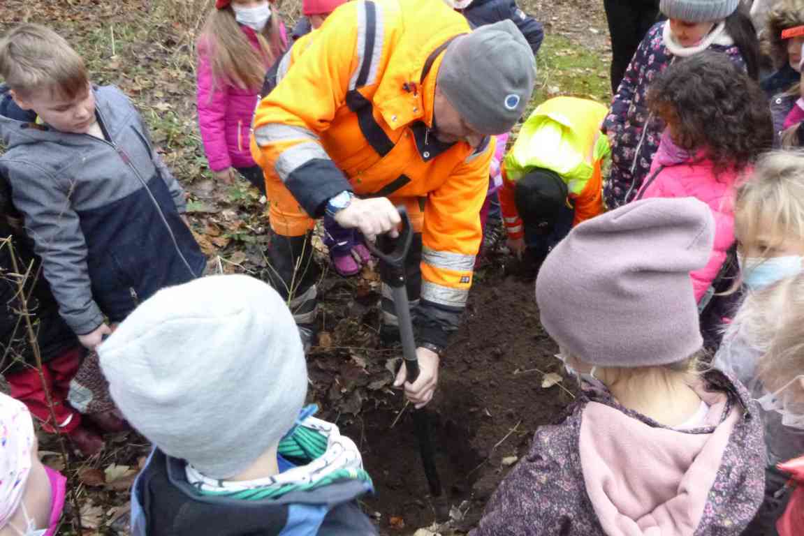 darauf, den eigenen Baum im Schulwald einpflanzen zu
